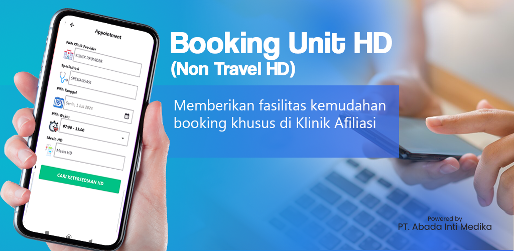 Booking Hemodialisa (Booking HD) hanya dapat dilakukan di Klinik-Klinik Provider yang berafiliasi dengan PT Abada Inti Medika sebelum melakukan Booking HD pastikan anda sudah terdaftar dan memiliki Akun di Dialisacare;
