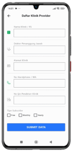 - Lengkapi semua isian Form Pendaftaran Provider : Nama Klinik, Dokter Penanggung Jawab, Alamat Klinik, No Handphone / WhatsApp, dan No Ijin Pendirian Klinik