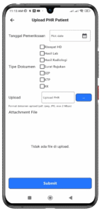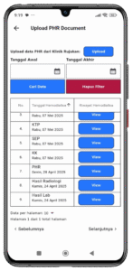 Klik View untuk melihat detail PHR; PHR akan otomatis terisi saat pasien sudah selesai melakukan tindakan hemodialisa yang diinput oleh Klinik Provider; untuk Upload Dokumen atau PHR klik tombol Upload maka akan tampil halaman berikutnya: